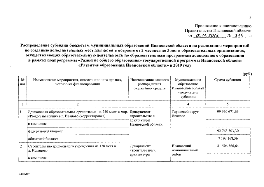 Постановление Правительства Ивановской области от 12.11.2018 N 318-п "О распределении субсидий бюджетам муниципальных образований Ивановской области на реализацию мероприятий по созданию дополнительных мест для детей в возрасте от 2 месяцев до 3 лет в образовательных организациях, осуществляющих образовательную деятельность по образовательным программам дошкольного образования в рамках подпрограммы "Развитие общего образования" государственной программы Ивановской области "Развитие образования Ивановской области" в 2019 году"