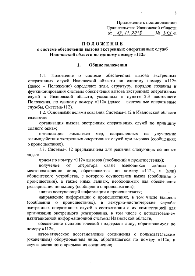 Постановление Правительства Ивановской области от 12.11.2018 N 317-п "О системе обеспечения вызова экстренных оперативных служб Ивановской области по единому номеру "112" (вместе с "Положением о системе обеспечения вызова экстренных оперативных служб Ивановской области по единому номеру "112")