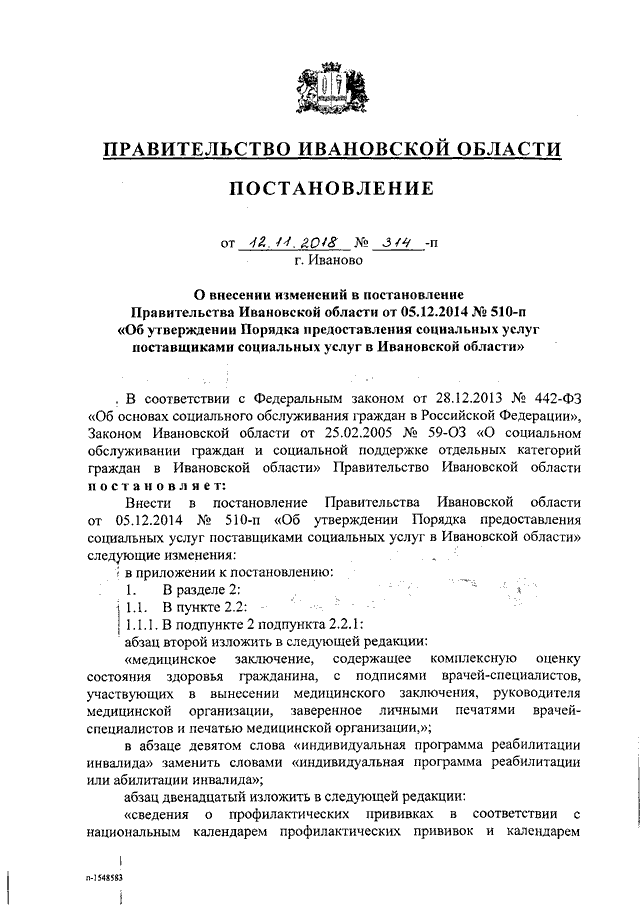 Постановление Правительства Ивановской области от 12.11.2018 N 314-п "О внесении изменений в постановление Правительства Ивановской области от 05.12.2014 N 510-п "Об утверждении Порядка предоставления социальных услуг поставщиками социальных услуг в Ивановской области"