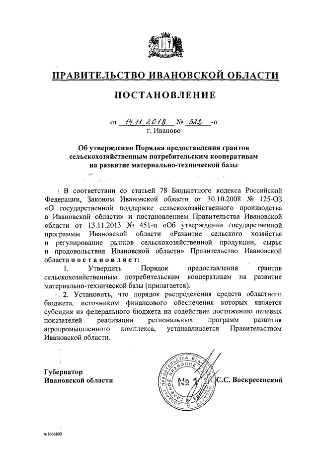 Постановление Правительства Ивановской области от 14.11.2018 N 322-п "Об утверждении Порядка предоставления грантов сельскохозяйственным потребительским кооперативам на развитие материально-технической базы"