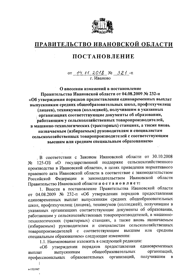 Постановление Правительства Ивановской области от 14.11.2018 N 321-п "О внесении изменений в постановление Правительства Ивановской области от 04.08.2009 N 232-п "Об утверждении порядков предоставления единовременных выплат выпускникам средних общеобразовательных школ, профтехучилищ (лицеев), техникумов (колледжей), получившим в указанных организациях соответствующие документы об образовании, работающим у сельскохозяйственных товаропроизводителей, в машинно-технологических (тракторных) станциях, а также вновь назначаемым (избираемым) руководителям и специалистам сельскохозяйственных товаропроизводителей с соответствующим высшим или средним специальным образованием"