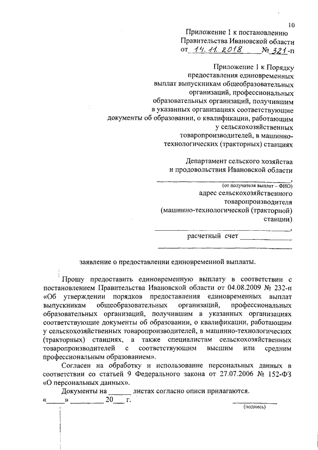 Постановление Правительства Ивановской области от 14.11.2018 N 321-п "О внесении изменений в постановление Правительства Ивановской области от 04.08.2009 N 232-п "Об утверждении порядков предоставления единовременных выплат выпускникам средних общеобразовательных школ, профтехучилищ (лицеев), техникумов (колледжей), получившим в указанных организациях соответствующие документы об образовании, работающим у сельскохозяйственных товаропроизводителей, в машинно-технологических (тракторных) станциях, а также вновь назначаемым (избираемым) руководителям и специалистам сельскохозяйственных товаропроизводителей с соответствующим высшим или средним специальным образованием"