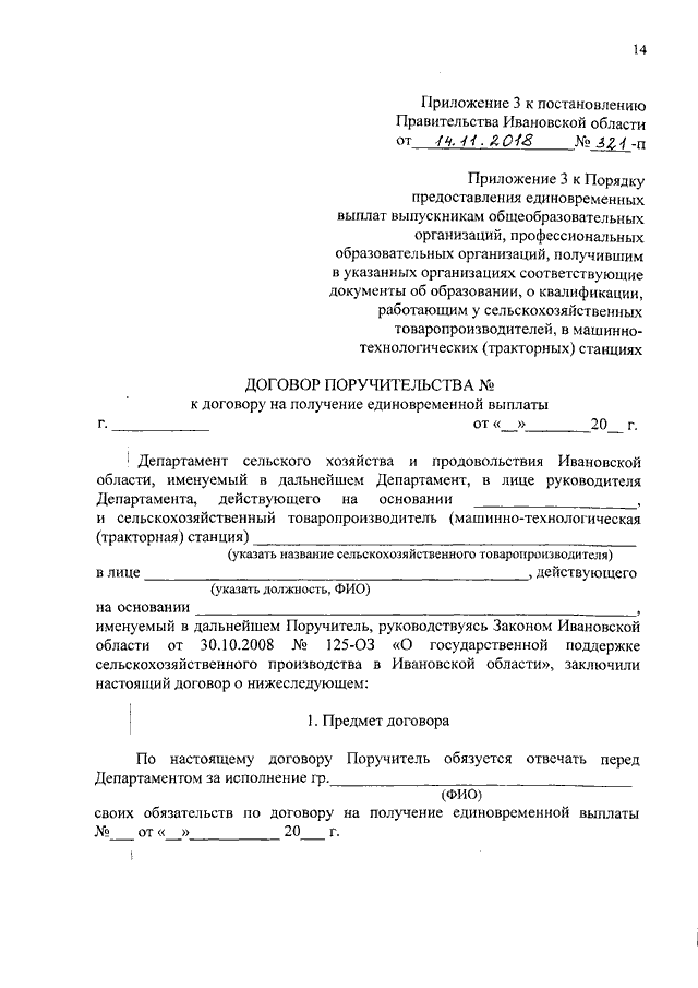 Постановление Правительства Ивановской области от 14.11.2018 N 321-п "О внесении изменений в постановление Правительства Ивановской области от 04.08.2009 N 232-п "Об утверждении порядков предоставления единовременных выплат выпускникам средних общеобразовательных школ, профтехучилищ (лицеев), техникумов (колледжей), получившим в указанных организациях соответствующие документы об образовании, работающим у сельскохозяйственных товаропроизводителей, в машинно-технологических (тракторных) станциях, а также вновь назначаемым (избираемым) руководителям и специалистам сельскохозяйственных товаропроизводителей с соответствующим высшим или средним специальным образованием"