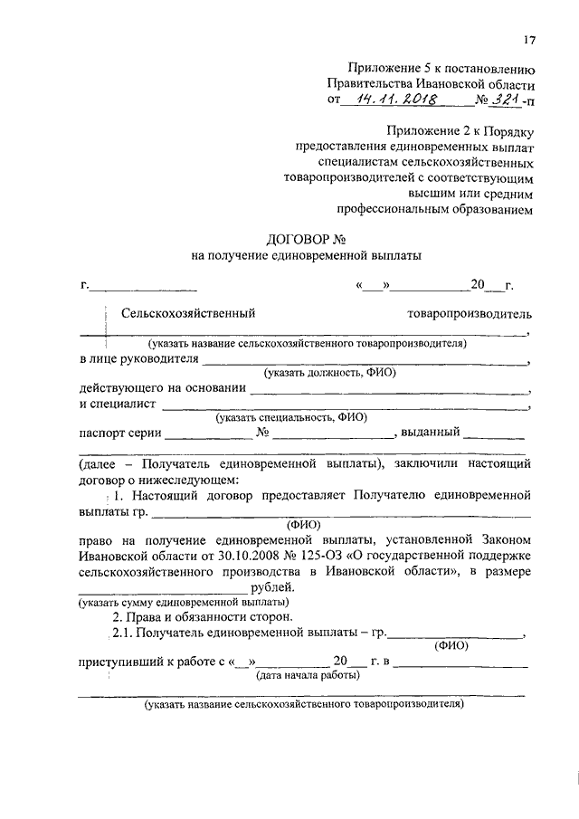Постановление Правительства Ивановской области от 14.11.2018 N 321-п "О внесении изменений в постановление Правительства Ивановской области от 04.08.2009 N 232-п "Об утверждении порядков предоставления единовременных выплат выпускникам средних общеобразовательных школ, профтехучилищ (лицеев), техникумов (колледжей), получившим в указанных организациях соответствующие документы об образовании, работающим у сельскохозяйственных товаропроизводителей, в машинно-технологических (тракторных) станциях, а также вновь назначаемым (избираемым) руководителям и специалистам сельскохозяйственных товаропроизводителей с соответствующим высшим или средним специальным образованием"