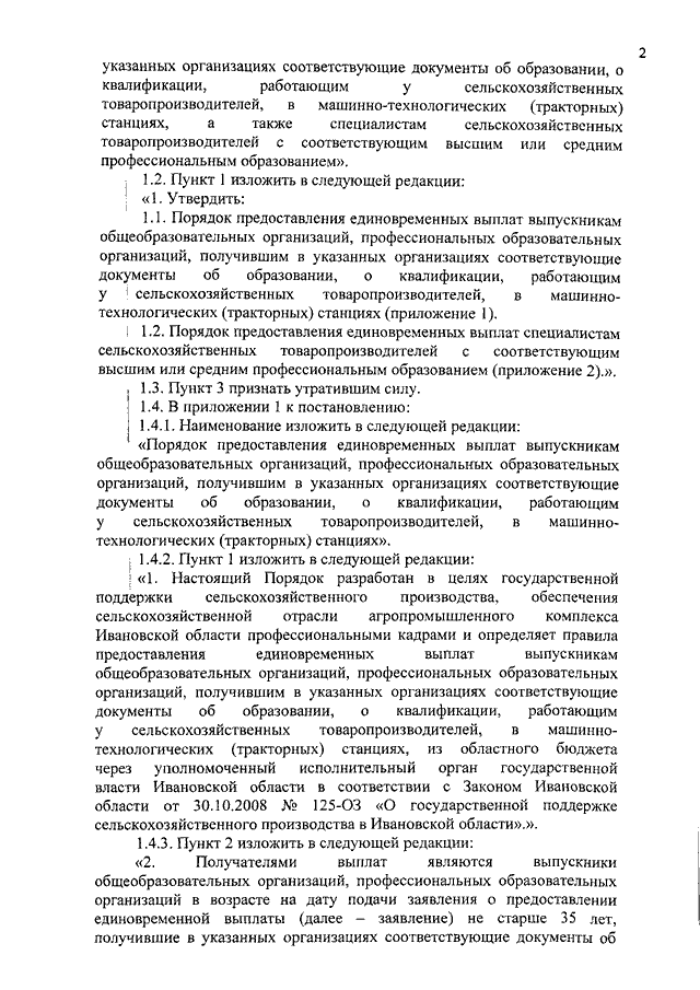 Постановление Правительства Ивановской области от 14.11.2018 N 321-п "О внесении изменений в постановление Правительства Ивановской области от 04.08.2009 N 232-п "Об утверждении порядков предоставления единовременных выплат выпускникам средних общеобразовательных школ, профтехучилищ (лицеев), техникумов (колледжей), получившим в указанных организациях соответствующие документы об образовании, работающим у сельскохозяйственных товаропроизводителей, в машинно-технологических (тракторных) станциях, а также вновь назначаемым (избираемым) руководителям и специалистам сельскохозяйственных товаропроизводителей с соответствующим высшим или средним специальным образованием"