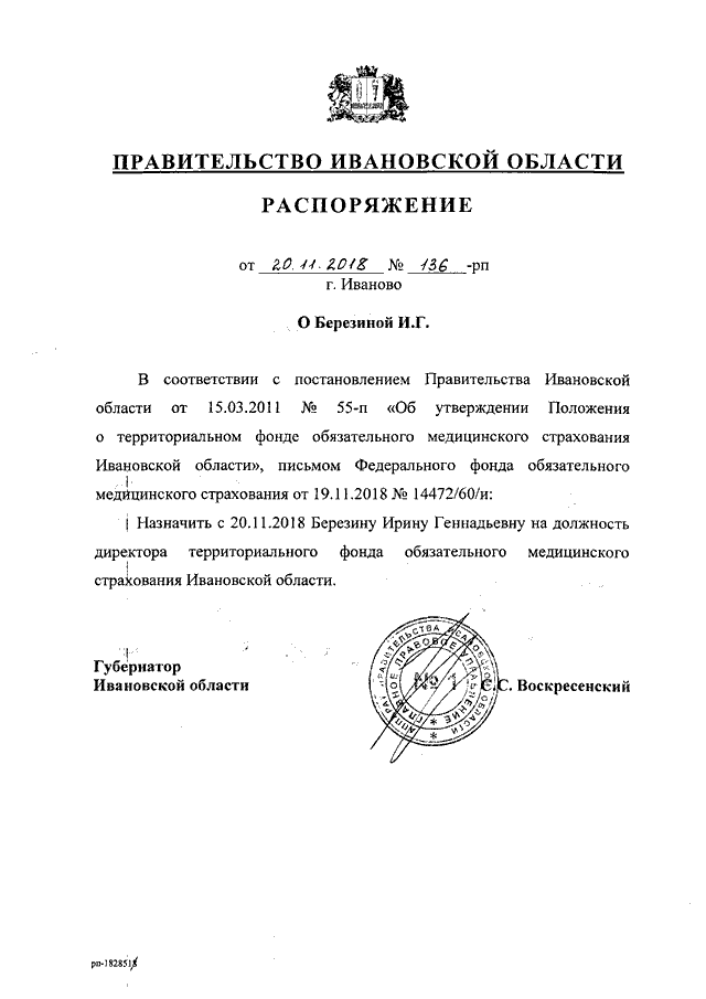 Распоряжение Правительства Ивановской области от 20.11.2018 N 136-рп "О Березиной И.Г."