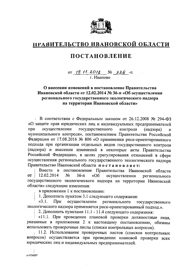 Постановление Правительства Ивановской области от 19.11.2018 N 326-п "О внесении изменений в постановление Правительства Ивановской области от 12.02.2014 N 36-п "Об осуществлении регионального государственного экологического надзора на территории Ивановской области"