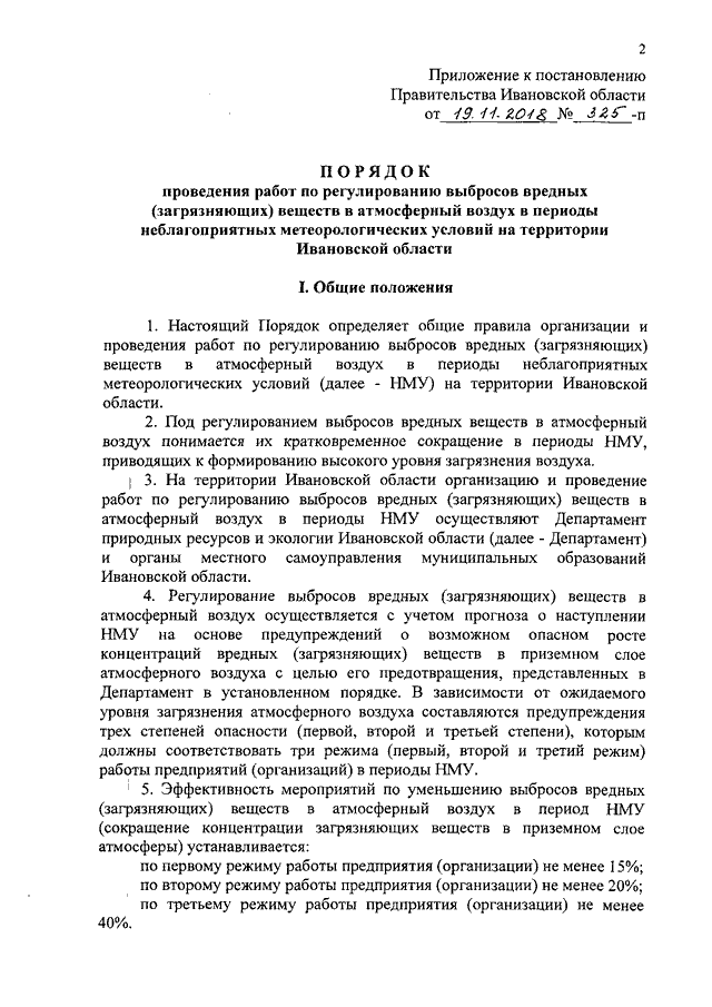 Постановление Правительства Ивановской области от 19.11.2018 N 325-п "Об утверждении Порядка проведения работ по регулированию выбросов вредных (загрязняющих) веществ в атмосферный воздух в периоды неблагоприятных метеорологических условий на территории Ивановской области"
