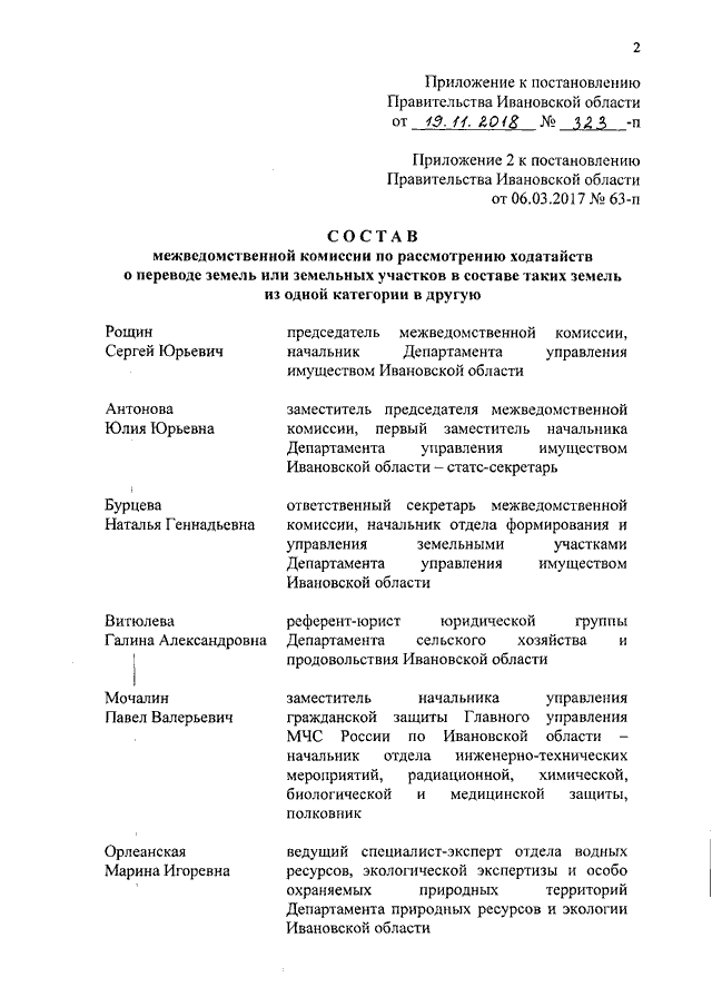 Постановление Правительства Ивановской области от 19.11.2018 N 323-п "О внесении изменений в постановление Правительства Ивановской области от 06.03.2017 N 63-п "О рассмотрении ходатайств о переводе земель или земельных участков в составе таких земель из одной категории в другую"