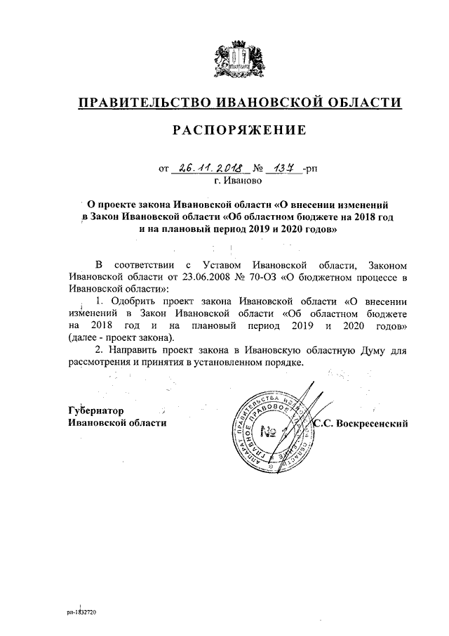 Распоряжение Правительства Ивановской области от 26.11.2018 N 137-рп "О проекте закона Ивановской области "О внесении изменений в Закон Ивановской области "Об областном бюджете на 2018 год и на плановый период 2019 и 2020 годов"