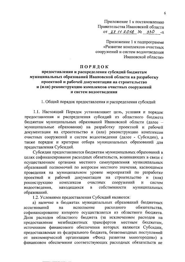 Постановление Правительства Ивановской области от 27.11.2018 N 330-п "О внесении изменений в постановление Правительства Ивановской области от 13.11.2013 N 452-п "Об утверждении государственной программы Ивановской области "Охрана окружающей среды Ивановской области" (вместе с "Порядком предоставления и распределения субсидий бюджетам муниципальных образований Ивановской области на разработку проектной и рабочей документации на строительство и (или) реконструкцию комплексов очистных сооружений и систем водоотведения", "Порядком предоставления и распределения субсидий бюджетам муниципальных образований Ивановской области на строительство и (или) реконструкцию комплексов очистных сооружений и систем водоотведения")