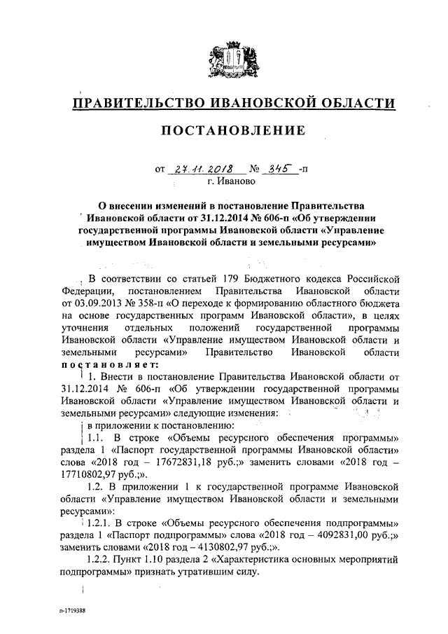 Постановление Правительства Ивановской области от 27.11.2018 N 345-п "О внесении изменений в постановление Правительства Ивановской области от 31.12.2014 N 606-п "Об утверждении государственной программы Ивановской области "Управление имуществом Ивановской области и земельными ресурсами"