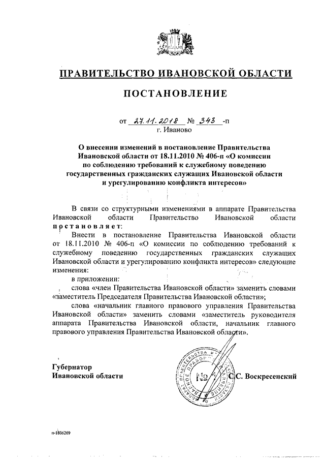 Постановление Правительства Ивановской области от 27.11.2018 N 343-п "О внесении изменений в постановление Правительства Ивановской области от 18.11.2010 N 406-п "О комиссии по соблюдению требований к служебному поведению государственных гражданских служащих Ивановской области и урегулированию конфликта интересов"