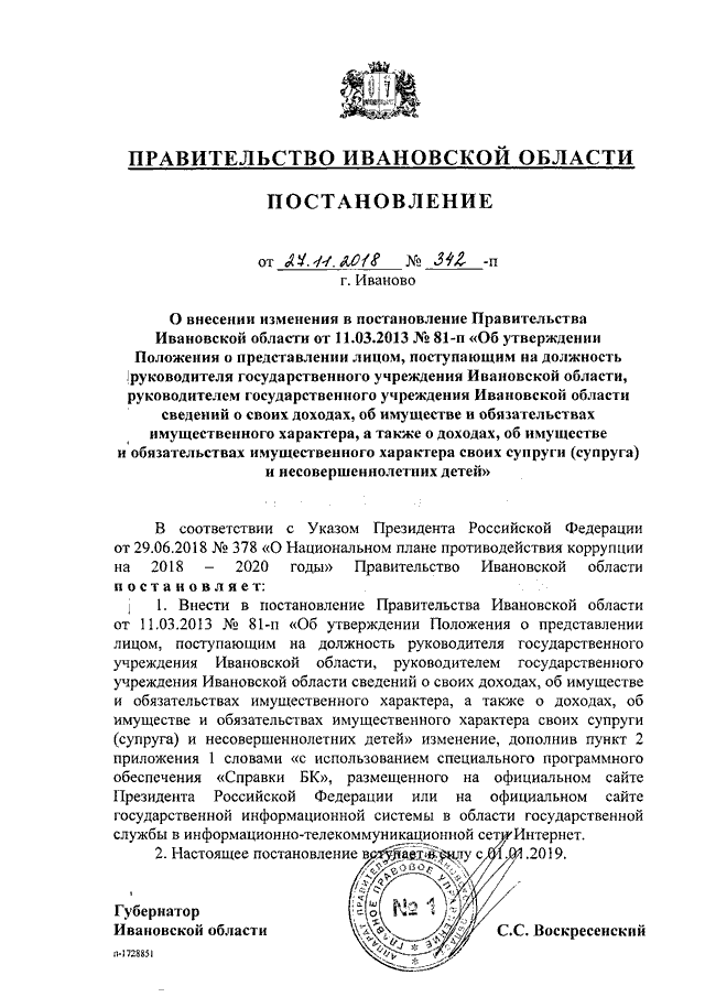 Постановление Правительства Ивановской области от 27.11.2018 N 342-п "О внесении изменения в постановление Правительства Ивановской области от 11.03.2013 N 81-п "Об утверждении Положения о представлении лицом, поступающим на должность руководителя государственного учреждения Ивановской области, руководителем государственного учреждения Ивановской области сведений о своих доходах, об имуществе и обязательствах имущественного характера, а также о доходах, об имуществе и обязательствах имущественного характера своих супруги (супруга) и несовершеннолетних детей"