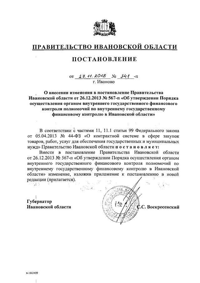 Постановление Правительства Ивановской области от 27.11.2018 N 341-п "О внесении изменения в постановление Правительства Ивановской области от 26.12.2013 N 567-п "Об утверждении Порядка осуществления органом внутреннего государственного финансового контроля полномочий по внутреннему государственному финансовому контролю в Ивановской области"