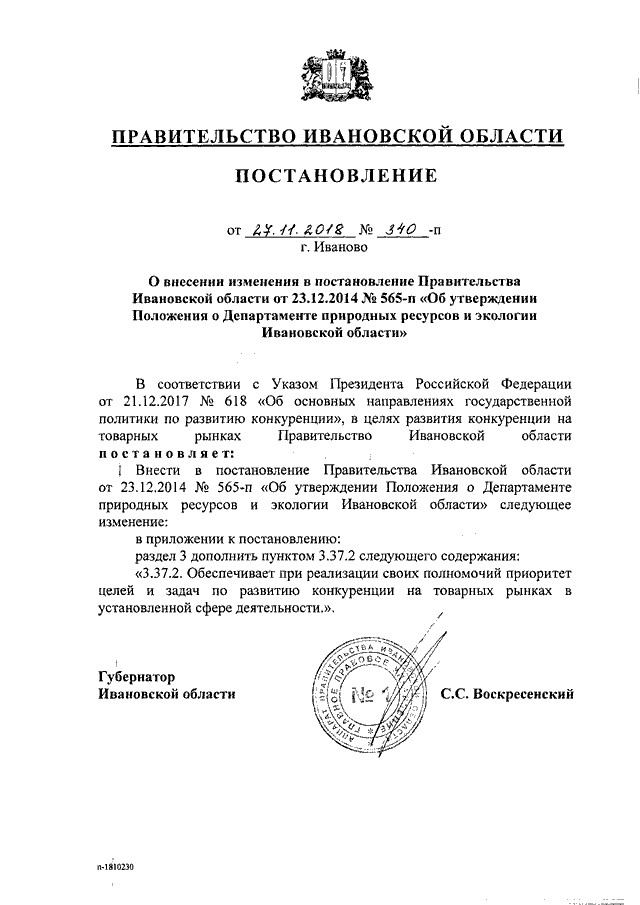 Постановление Правительства Ивановской области от 27.11.2018 N 340-п "О внесении изменения в постановление Правительства Ивановской области от 23.12.2014 N 565-п "Об утверждении Положения о Департаменте природных ресурсов и экологии Ивановской области"