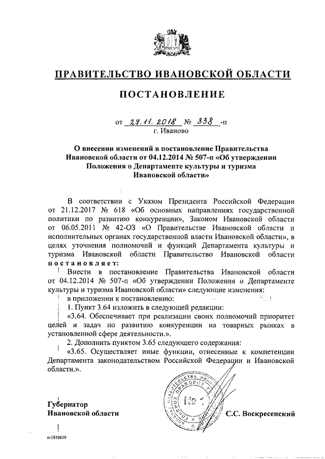 Постановление Правительства Ивановской области от 27.11.2018 N 338-п "О внесении изменений в постановление Правительства Ивановской области от 04.12.2014 N 507-п "Об утверждении Положения о Департаменте культуры и туризма Ивановской области"