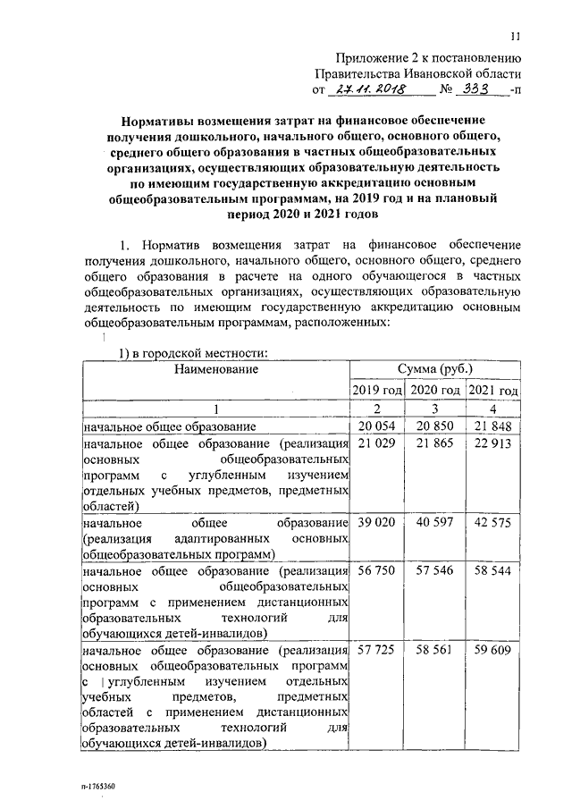 Постановление Правительства Ивановской области от 27.11.2018 N 333-п "Об утверждении нормативов обеспечения государственных гарантий реализации прав на получение общедоступного и бесплатного общего образования, обеспечения дополнительного образования в муниципальных образовательных организациях и возмещения затрат на финансовое обеспечение получения общего образования в частных образовательных организациях на 2019 год и на плановый период 2020 и 2021 годов" (вместе с "Нормативами обеспечения государственных гарантий реализации прав на получение общедоступного и бесплатного дошкольного, начального общего, основного общего, среднего общего образования в муниципальных общеобразовательных организациях, обеспечения дополнительного образования в муниципальных общеобразовательных организациях на 2019 год и на плановый период 2020 и 2021 годов", "Нормативами возмещения затрат на финансовое обеспечение получения дошкольного, начального общего, основного общего, среднего общего образования в частных общеобразовательных организациях, осуществляющих образовательную деятельность по имеющим государственную аккредитацию основным общеобразовательным программам, на 2019 год и на плановый период 2020 и 2021 годов", "Нормативами обеспечения государственных гарантий реализации прав на получение общедоступного и бесплатного дошкольного образования в муниципальных дошкольных образовательных организациях на 2019 год и на плановый период 2020 и 2021 годов", "Нормативами возмещения затрат на финансовое обеспечение получения дошкольного образования в частных дошкольных образовательных организациях на 2019 год и на плановый период 2020 и 2021 годов", "Перечнем малокомплектных муниципальных общеобразовательных организаций, для которых применяется норматив финансового обеспечения, учитывающий затраты, не зависящие от количества обучающихся, для расчета субвенций местным бюджетам в размере, необходимом для реализации основных общеобразовательных программ в части финансирования расходов на оплату труда работников общеобразовательных организаций, расходов на учебники, учебные пособия, средства обучения, игры, игрушки (за исключением расходов на содержание зданий и оплату коммунальных услуг, осуществляемых из местных бюджетов)")