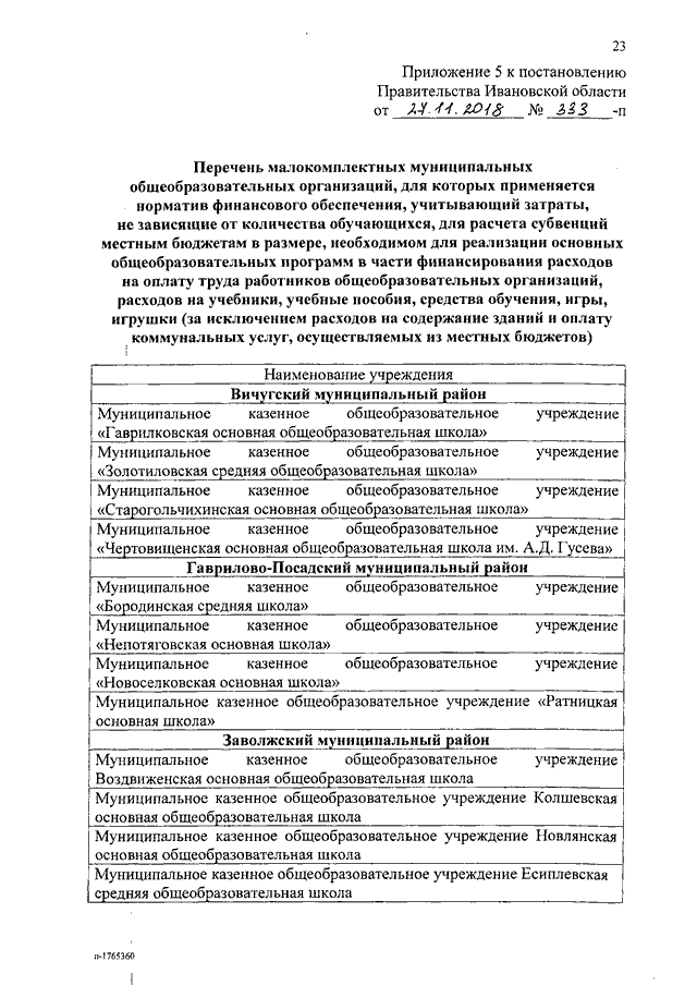 Постановление Правительства Ивановской области от 27.11.2018 N 333-п "Об утверждении нормативов обеспечения государственных гарантий реализации прав на получение общедоступного и бесплатного общего образования, обеспечения дополнительного образования в муниципальных образовательных организациях и возмещения затрат на финансовое обеспечение получения общего образования в частных образовательных организациях на 2019 год и на плановый период 2020 и 2021 годов" (вместе с "Нормативами обеспечения государственных гарантий реализации прав на получение общедоступного и бесплатного дошкольного, начального общего, основного общего, среднего общего образования в муниципальных общеобразовательных организациях, обеспечения дополнительного образования в муниципальных общеобразовательных организациях на 2019 год и на плановый период 2020 и 2021 годов", "Нормативами возмещения затрат на финансовое обеспечение получения дошкольного, начального общего, основного общего, среднего общего образования в частных общеобразовательных организациях, осуществляющих образовательную деятельность по имеющим государственную аккредитацию основным общеобразовательным программам, на 2019 год и на плановый период 2020 и 2021 годов", "Нормативами обеспечения государственных гарантий реализации прав на получение общедоступного и бесплатного дошкольного образования в муниципальных дошкольных образовательных организациях на 2019 год и на плановый период 2020 и 2021 годов", "Нормативами возмещения затрат на финансовое обеспечение получения дошкольного образования в частных дошкольных образовательных организациях на 2019 год и на плановый период 2020 и 2021 годов", "Перечнем малокомплектных муниципальных общеобразовательных организаций, для которых применяется норматив финансового обеспечения, учитывающий затраты, не зависящие от количества обучающихся, для расчета субвенций местным бюджетам в размере, необходимом для реализации основных общеобразовательных программ в части финансирования расходов на оплату труда работников общеобразовательных организаций, расходов на учебники, учебные пособия, средства обучения, игры, игрушки (за исключением расходов на содержание зданий и оплату коммунальных услуг, осуществляемых из местных бюджетов)")
