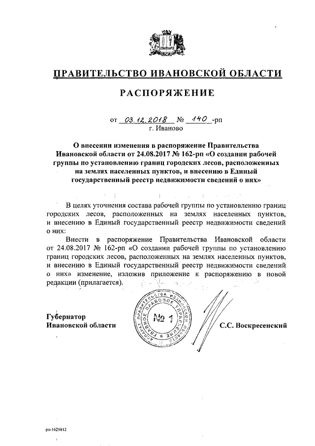 Распоряжение Правительства Ивановской области от 03.12.2018 N 140-рп "О внесении изменения в распоряжение Правительства Ивановской области от 24.08.2017 N 162-рп "О создании рабочей группы по установлению границ городских лесов, расположенных на землях населенных пунктов, и внесению в Единый государственный реестр недвижимости сведений о них"