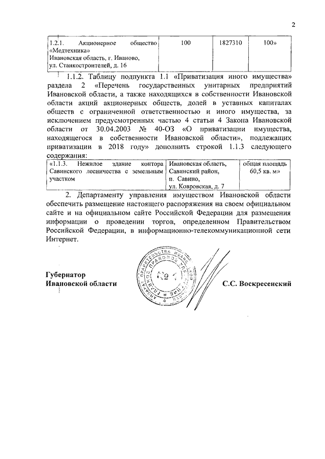 Распоряжение Правительства Ивановской области от 05.12.2018 N 143-рп "О внесении изменений в распоряжение Правительства Ивановской области от 22.03.2017 N 34-рп "Об утверждении прогнозного плана приватизации имущества, находящегося в собственности Ивановской области, на 2018 год"