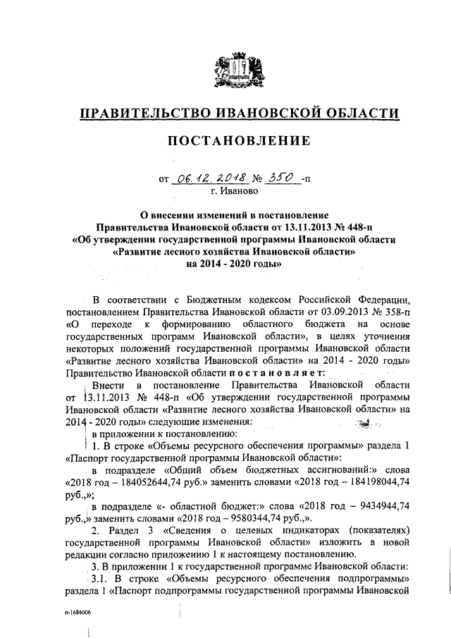 Постановление Правительства Ивановской области от 06.12.2018 N 350-п "О внесении изменений в постановление Правительства Ивановской области от 13.11.2013 N 448-п "Об утверждении государственной программы Ивановской области "Развитие лесного хозяйства Ивановской области" на 2014 - 2020 годы"