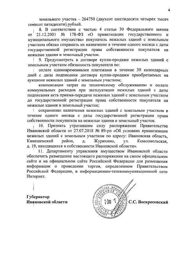 Распоряжение Правительства Ивановской области от 06.12.2018 N 146-рп "Об условиях приватизации нежилых зданий с земельным участком по адресу: Ивановская область, Кинешемский район, д. Журихино, ул. Комсомольская, д. 19, находящихся в собственности Ивановской области"