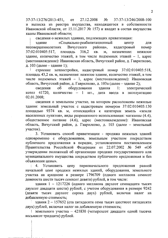Распоряжение Правительства Ивановской области от 06.12.2018 N 147-рп "Об условиях приватизации нежилых зданий с земельным участком по адресу: Ивановская область, Вичугский район, д. Гаврилково, д. 103, находящихся в собственности Ивановской области"