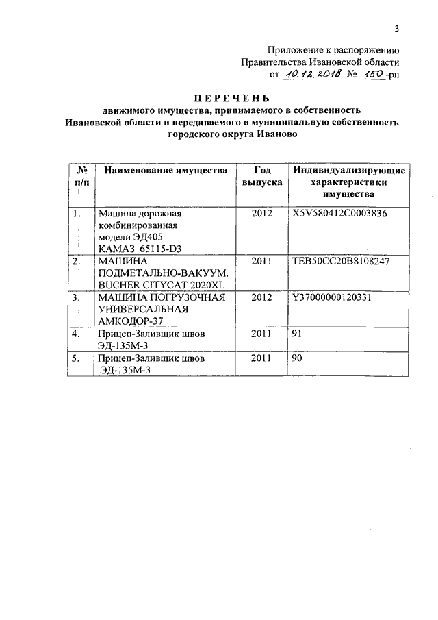 Распоряжение Правительства Ивановской области от 10.12.2018 N 150-рп "О принятии движимого имущества в собственность Ивановской области и передаче движимого имущества в муниципальную собственность городского округа Иваново"