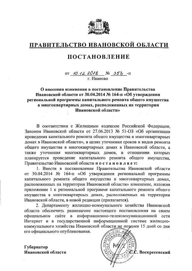 Постановление Правительства Ивановской области от 10.12.2018 N 353-п "О внесении изменения в постановление Правительства Ивановской области от 30.04.2014 N 164-п "Об утверждении региональной программы капитального ремонта общего имущества в многоквартирных домах, расположенных на территории Ивановской области" (вместе с "Перечнем многоквартирных домов, расположенных на территории Ивановской области, в отношении которых на период реализации программы планируется проведение капитального ремонта общего имущества")