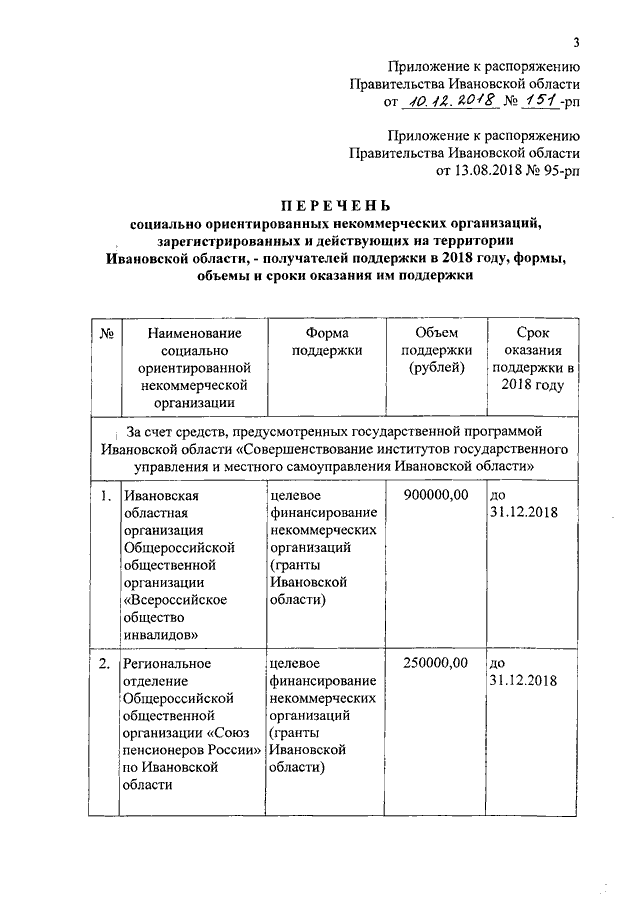 Распоряжение Правительства Ивановской области от 10.12.2018 N 151-рп "О внесении изменений в распоряжение Правительства Ивановской области от 13.08.2018 N 95-рп "О формах, объемах и сроках оказания поддержки социально ориентированным некоммерческим организациям, зарегистрированным и действующим на территории Ивановской области, в 2018 году" (вместе с "Перечнем социально ориентированных некоммерческих организаций, зарегистрированных и действующих на территории Ивановской области, - получателей поддержки в 2018 году, формы, объемы и сроки оказания им поддержки")