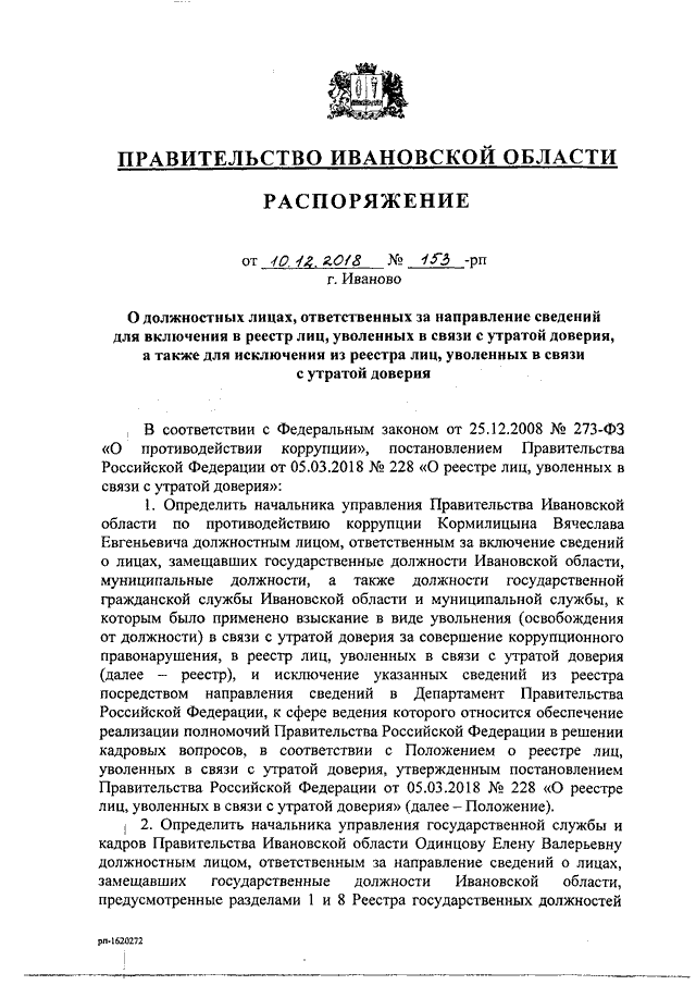 Распоряжение Правительства Ивановской области от 10.12.2018 N 153-рп "О должностных лицах, ответственных за направление сведений для включения в реестр лиц, уволенных в связи с утратой доверия, а также для исключения из реестра лиц, уволенных в связи с утратой доверия"