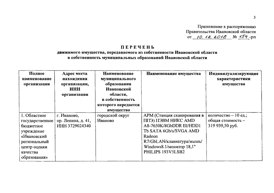 Распоряжение Правительства Ивановской области от 10.12.2018 N 154-рп "О передаче движимого имущества из собственности Ивановской области в собственность муниципальных образований Ивановской области"