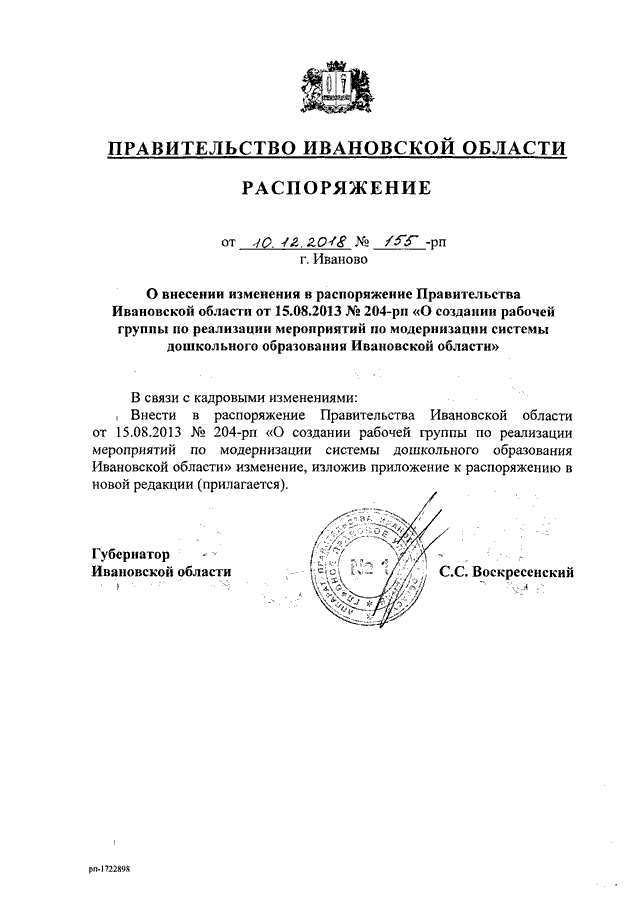 Распоряжение Правительства Ивановской области от 10.12.2018 N 155-рп "О внесении изменения в распоряжение Правительства Ивановской области от 15.08.2013 N 204-рп "О создании рабочей группы по реализации мероприятий по модернизации системы дошкольного образования Ивановской области"