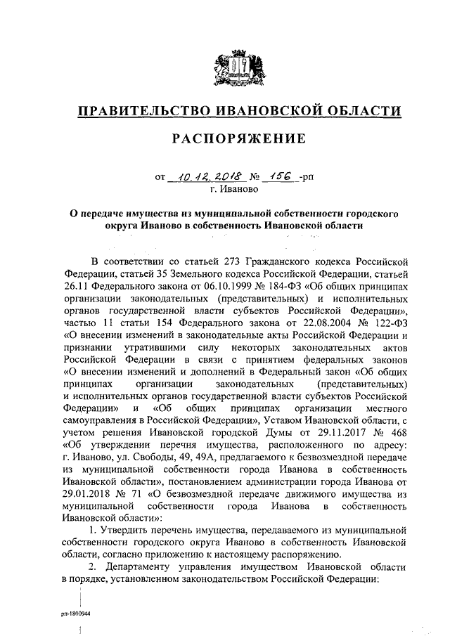 Распоряжение Правительства Ивановской области от 10.12.2018 N 156-рп "О передаче имущества из муниципальной собственности городского округа Иваново в собственность Ивановской области"