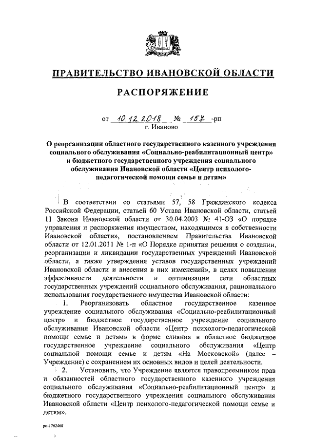 Распоряжение Правительства Ивановской области от 10.12.2018 N 157-рп "О реорганизации областного государственного казенного учреждения социального обслуживания "Социально-реабилитационный центр" и бюджетного государственного учреждения социального обслуживания Ивановской области "Центр психолого-педагогической помощи семье и детям"