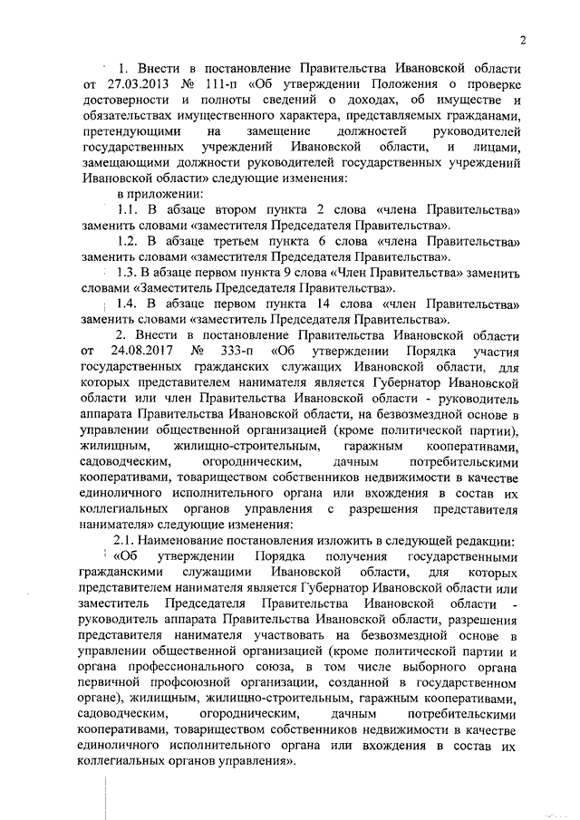Постановление Правительства Ивановской области от 10.12.2018 N 359-п "О внесении изменений в постановления Правительства Ивановской области от 27.03.2013 N 111-п "Об утверждении Положения о проверке достоверности и полноты сведений о доходах, об имуществе и обязательствах имущественного характера, представляемых гражданами, претендующими на замещение должностей руководителей государственных учреждений Ивановской области, и лицами, замещающими должности руководителей государственных учреждений Ивановской области" и от 24.08.2017 N 333-п "Об утверждении Порядка участия государственных гражданских служащих Ивановской области, для которых представителем нанимателя является Губернатор Ивановской области или член Правительства Ивановской области - руководитель аппарата Правительства Ивановской области, на безвозмездной основе в управлении общественной организацией (кроме политической партии), жилищным, жилищно-строительным, гаражным кооперативами, садоводческим, огородническим, дачным потребительскими кооперативами, товариществом собственников недвижимости в качестве единоличного исполнительного органа или вхождения в состав их коллегиальных органов управления с разрешения представителя нанимателя"