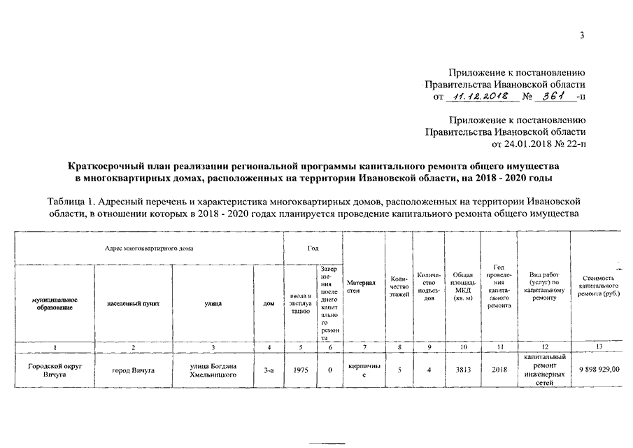 Постановление Правительства Ивановской области от 11.12.2018 N 361-п "О внесении изменения в постановление Правительства Ивановской области от 24.01.2018 N 22-п "Об утверждении краткосрочного плана реализации региональной программы капитального ремонта общего имущества в многоквартирных домах, расположенных на территории Ивановской области, на 2018 - 2020 годы"