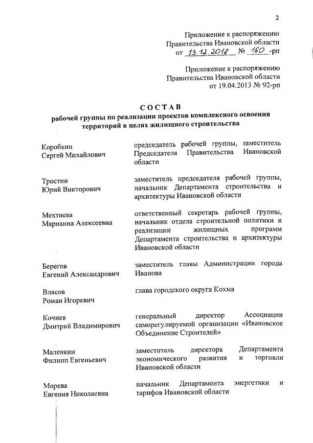Распоряжение Правительства Ивановской области от 13.12.2018 N 160-рп "О внесении изменения в распоряжение Правительства Ивановской области от 19.04.2013 N 92-рп "О создании рабочей группы по реализации проектов комплексного освоения территорий в целях жилищного строительства"