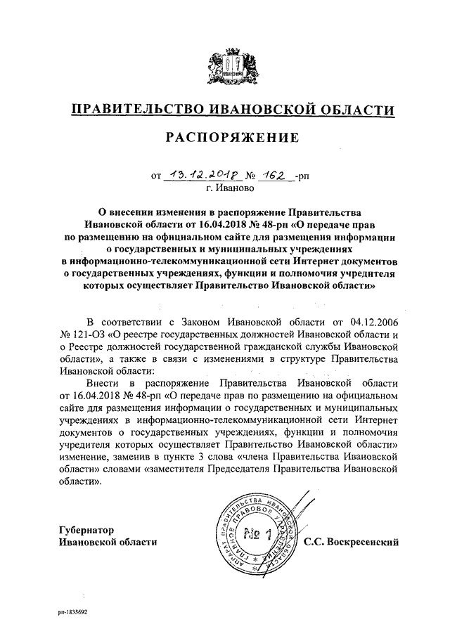 Распоряжение Правительства Ивановской области от 13.12.2018 N 162-рп "О внесении изменения в распоряжение Правительства Ивановской области от 16.04.2018 N 48-рп "О передаче прав по размещению на официальном сайте для размещения информации о государственных и муниципальных учреждениях в информационно-телекоммуникационной сети Интернет документов о государственных учреждениях, функции и полномочия учредителя которых осуществляет Правительство Ивановской области"
