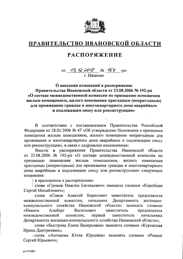 Распоряжение Правительства Ивановской области от 13.12.2018 N 164-рп "О внесении изменений в распоряжение Правительства Ивановской области от 23.08.2006 N 192-рп "О составе межведомственной комиссии по признанию помещения жилым помещением, жилого помещения пригодным (непригодным) для проживания граждан и многоквартирного дома аварийным и подлежащим сносу или реконструкции"