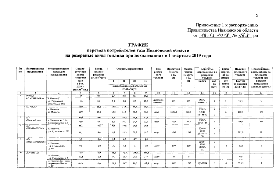 Распоряжение Правительства Ивановской области от 13.12.2018 N 168-рп "Об утверждении графиков перевода потребителей газа Ивановской области на резервные виды топлива при похолоданиях в I квартале 2019 года и ограничения снабжения газом покупателей Ивановской области и очередности их отключения в случае нарушения технологического режима работы газотранспортной системы при аварии в I квартале 2019 года"