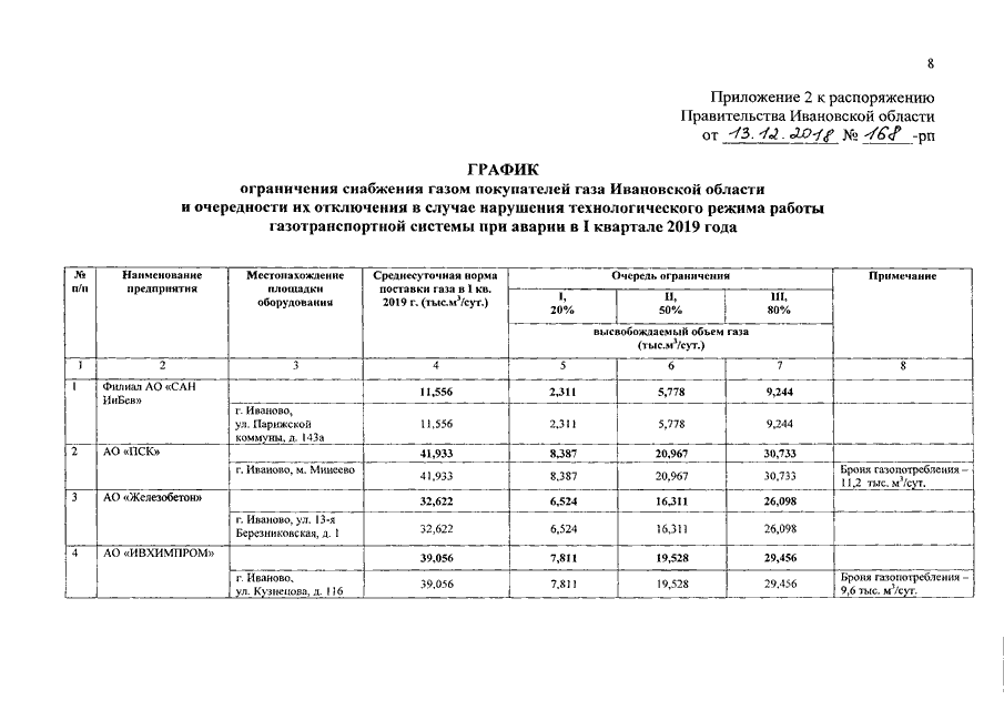 Распоряжение Правительства Ивановской области от 13.12.2018 N 168-рп "Об утверждении графиков перевода потребителей газа Ивановской области на резервные виды топлива при похолоданиях в I квартале 2019 года и ограничения снабжения газом покупателей Ивановской области и очередности их отключения в случае нарушения технологического режима работы газотранспортной системы при аварии в I квартале 2019 года"
