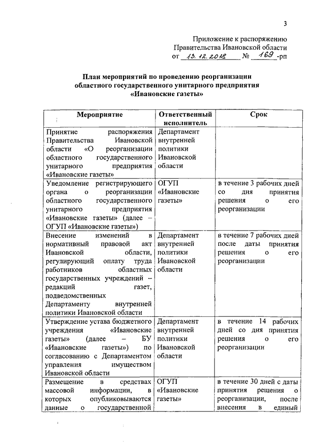 Распоряжение Правительства Ивановской области от 13.12.2018 N 169-рп "О реорганизации областного государственного унитарного предприятия "Ивановские газеты"