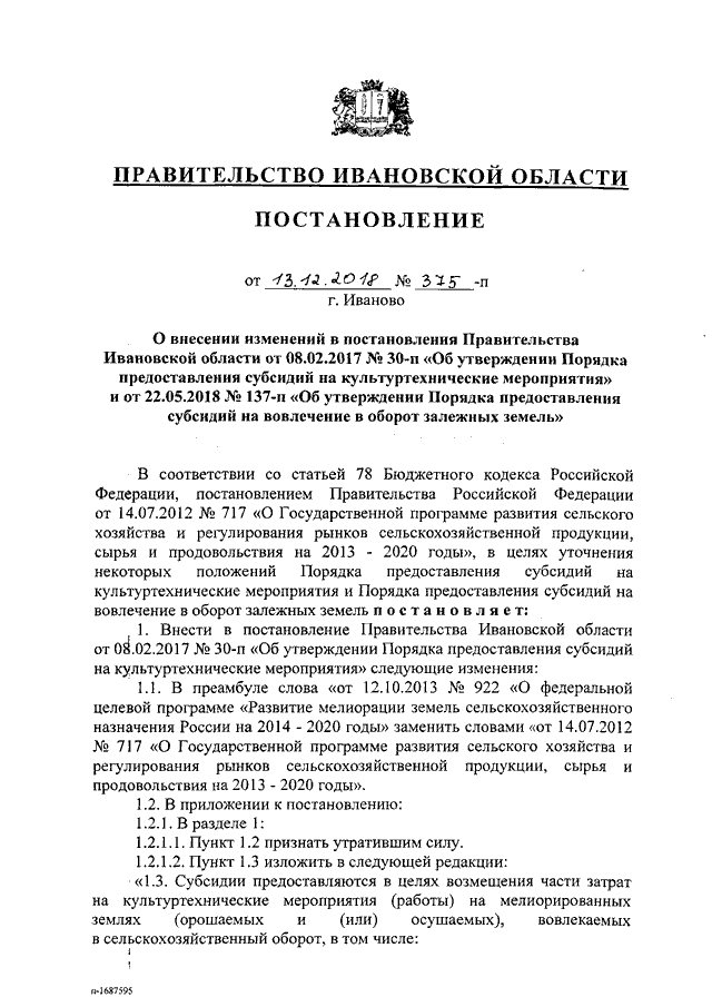 Постановление Правительства Ивановской области от 13.12.2018 N 375-п "О внесении изменений в постановления Правительства Ивановской области от 08.02.2017 N 30-п "Об утверждении Порядка предоставления субсидий на культуртехнические мероприятия" и от 22.05.2018 N 137-п "Об утверждении Порядка предоставления субсидий на вовлечение в оборот залежных земель"