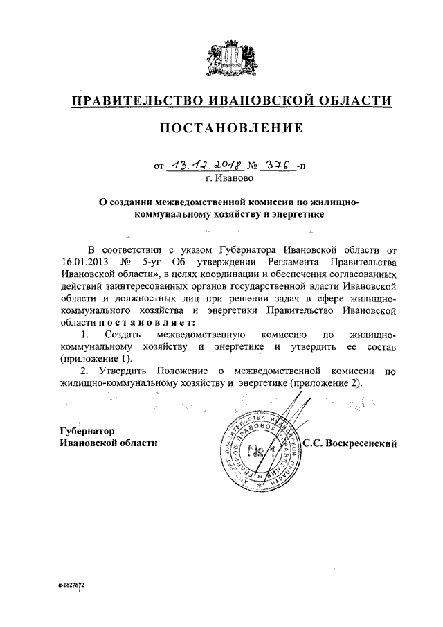 Постановление Правительства Ивановской области от 13.12.2018 N 376-п "О создании межведомственной комиссии по жилищно-коммунальному хозяйству и энергетике" (вместе с "Положением о межведомственной комиссии по вопросам жилищно-коммунального хозяйства и энергетике")