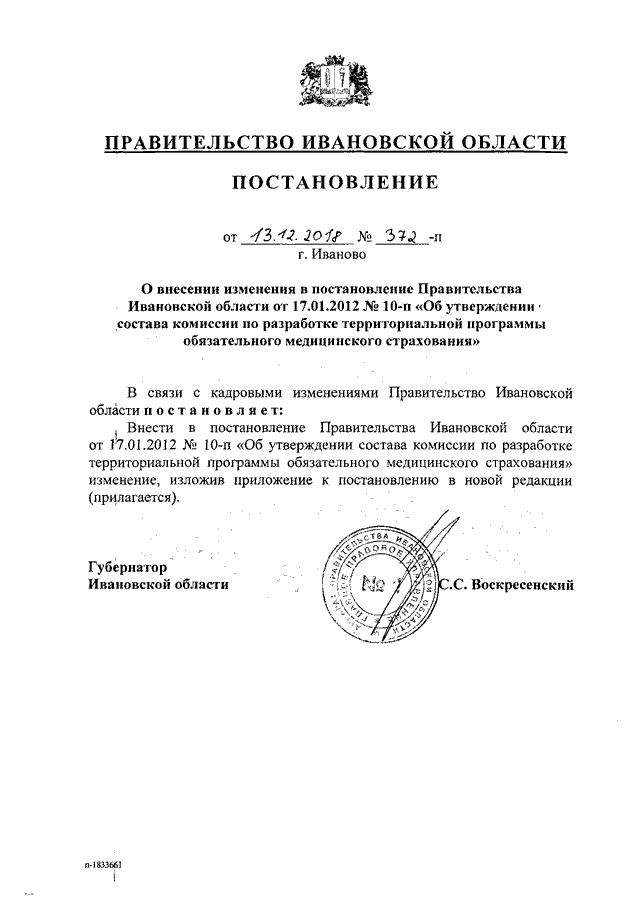 Постановление Правительства Ивановской области от 13.12.2018 N 372-п "О внесении изменения в постановление Правительства Ивановской области от 17.01.2012 N 10-п "Об утверждении состава комиссии по разработке территориальной программы обязательного медицинского страхования"