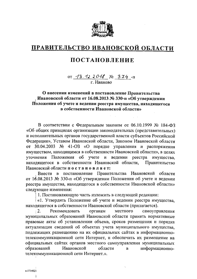 Постановление Правительства Ивановской области от 13.12.2018 N 374-п "О внесении изменений в постановление Правительства Ивановской области от 16.08.2013 N 330-п "Об утверждении Положения об учете и ведении реестра имущества, находящегося в собственности Ивановской области"