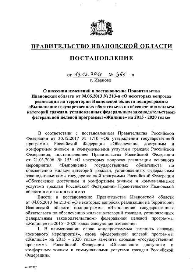Постановление Правительства Ивановской области от 13.12.2018 N 366-п "О внесении изменений в постановление Правительства Ивановской области от 04.06.2013 N 213-п "О некоторых вопросах реализации на территории Ивановской области подпрограммы "Выполнение государственных обязательств по обеспечению жильем категорий граждан, установленных федеральным законодательством" федеральной целевой программы "Жилище" на 2015 - 2020 годы"