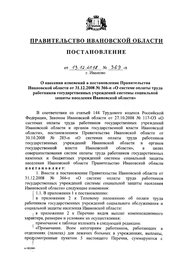 Постановление Правительства Ивановской области от 13.12.2018 N 369-п "О внесении изменений в постановление Правительства Ивановской области от 31.12.2008 N 366-п "О системе оплаты труда работников государственных учреждений системы социальной защиты населения Ивановской области"